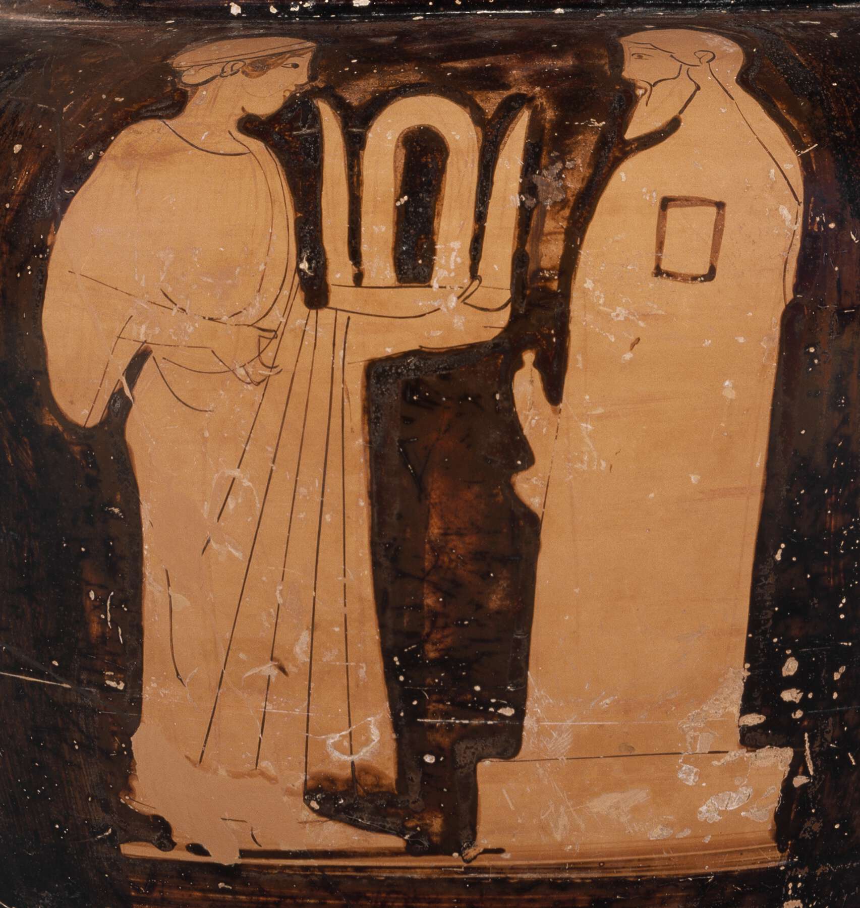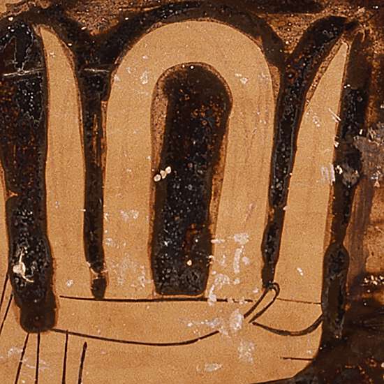 The boss on the side of the herm on entry no. 6 is black, while here it is a reserved square outlined in black; cf. also the boss on the herm on entry no. 9 (81.AE.37). For a similar herm, cf. a Nolan amphora by the Pan Painter in Laon, Musée de Laon 371023 (Abbreviation: ARV2J. D. Beazley. Attic Red-Figure Vase-Painters. 2nd ed. Oxford, 1963 553.23; Abbreviation: CVACorpus Vasorum Antiquorum Laon 1 [France 20], pls. I, III, 1, 27). Cf. also a column-krater by the Orchard Painter in Naples, Museo Archeologico Nazionale H 3369 (Abbreviation: ARV2J. D. Beazley. Attic Red-Figure Vase-Painters. 2nd ed. Oxford, 1963 523.9; G. Siebert, Abbreviation: LIMCLexicon Iconographicum Mythologiae Classicae. 1981–2009, vol. 5 (1990), pt. 1, p. 301, no. 100, s.v. “Hermes”), depicting a procession of females to a herm and an altar; a kanephoros (basket bearer) also stands in front of the herm on this vase. Aristophanes in Lysistrata (642–47) describes the kanephoros as the last religious role of an Athenian girl before marriage. This is mainly related to religious processions and consequently to scenes with similar iconography where the kanephoroi can be recognized as unmarried, but marriageable, young women. The presence of the herm is suggestive of a public space. The absence of an altar or a sacrificial animal could suggest that a bloodless sacrifice is depicted. For kanephoroi, see L. J. Roccos, “The Kanephoros and Her Festival Mantle in Greek Art,” Abbreviation: AJAAmerican Journal of Archaeology 99 (1995): 641–66; Abbreviation: PandoraPandora: Women in Classical Greece. Exh. cat. Walters Art Gallery. Edited by E. D. Reeder. Baltimore, 1995, pp. 185–87, cat. no. 38, and pp. 235–36, cat. no. 60, entries by E. Reeder; M. Dillon, Girls and Women in Classical Greek Religion (London, 2002), pp. 37–42; Worshiping Women: Ritual and Reality in Classical Athens, ed. N. Kaltsas and H. A. Shapiro (New York, 2008), pp. 218–19, cat. no. 95, entry by S. A. Waite; J. B. Connelly, “In Divine Affairs—the Greatest Part: Women and Priesthoods in Classical Athens,” in ibid., pp. 187–241.