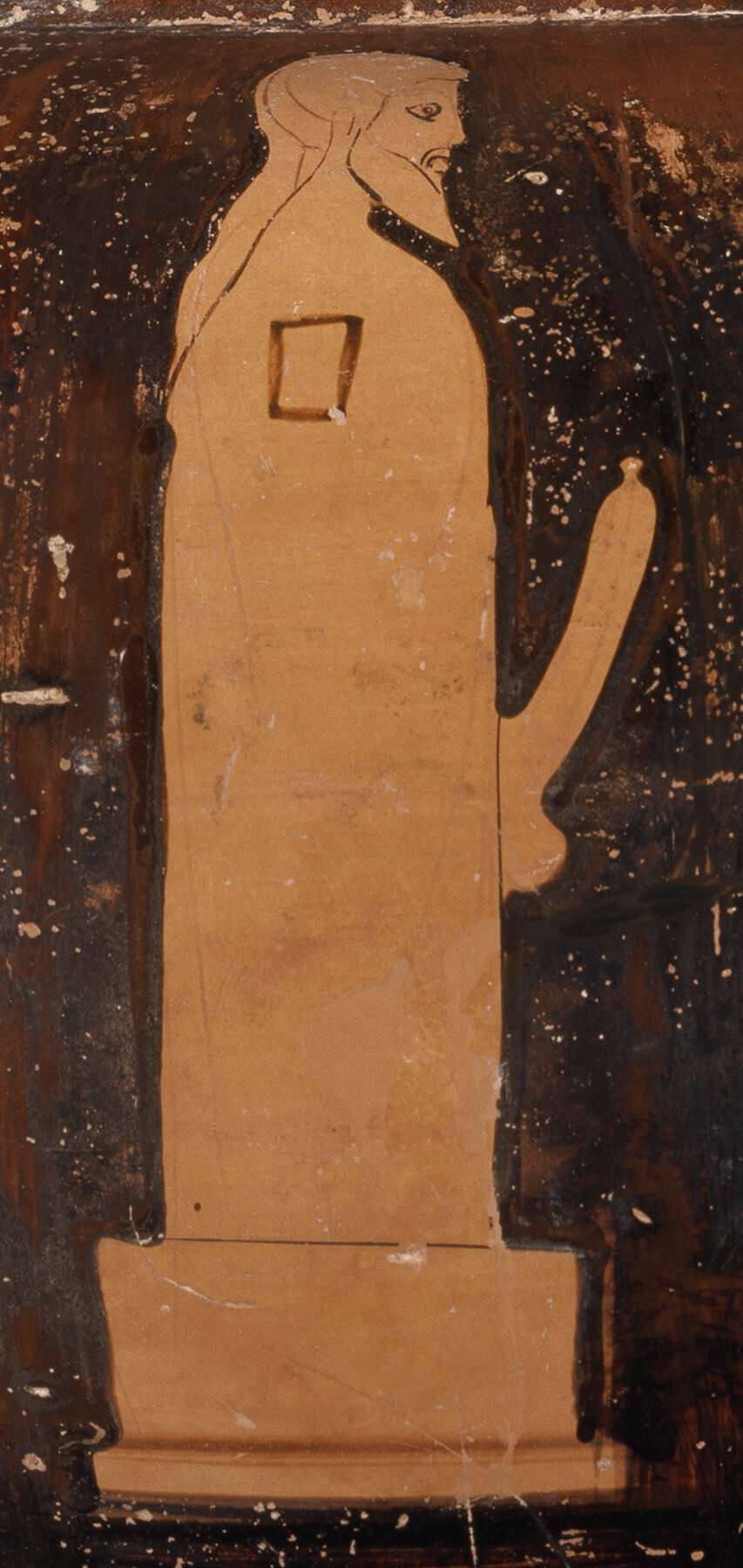 B. Ithyphallic herm in profile facing right. The herm stands on a base and is shown with long hair and beard in reserve. A rectangular boss is rendered as a reserved square outlined in black on the shaft.