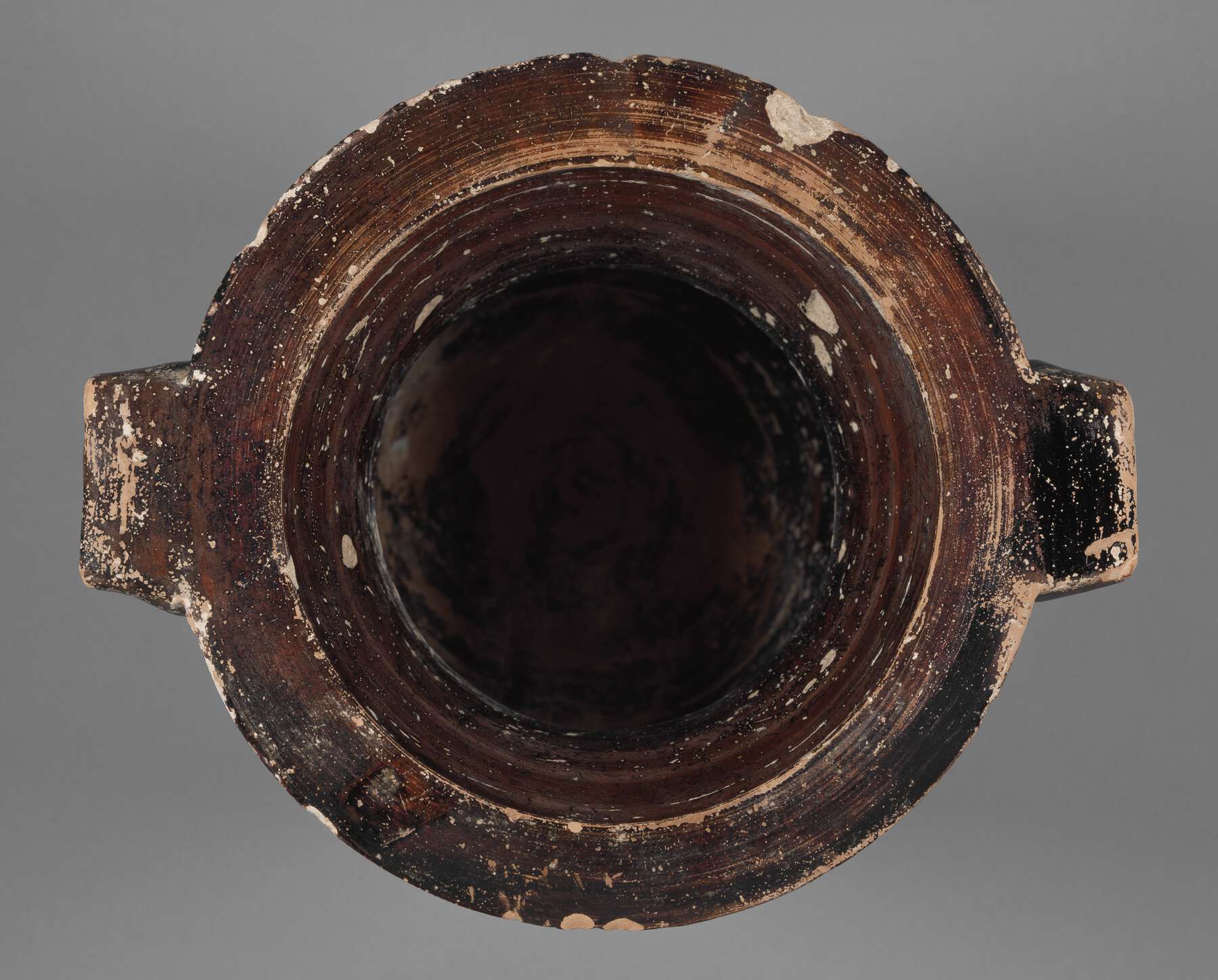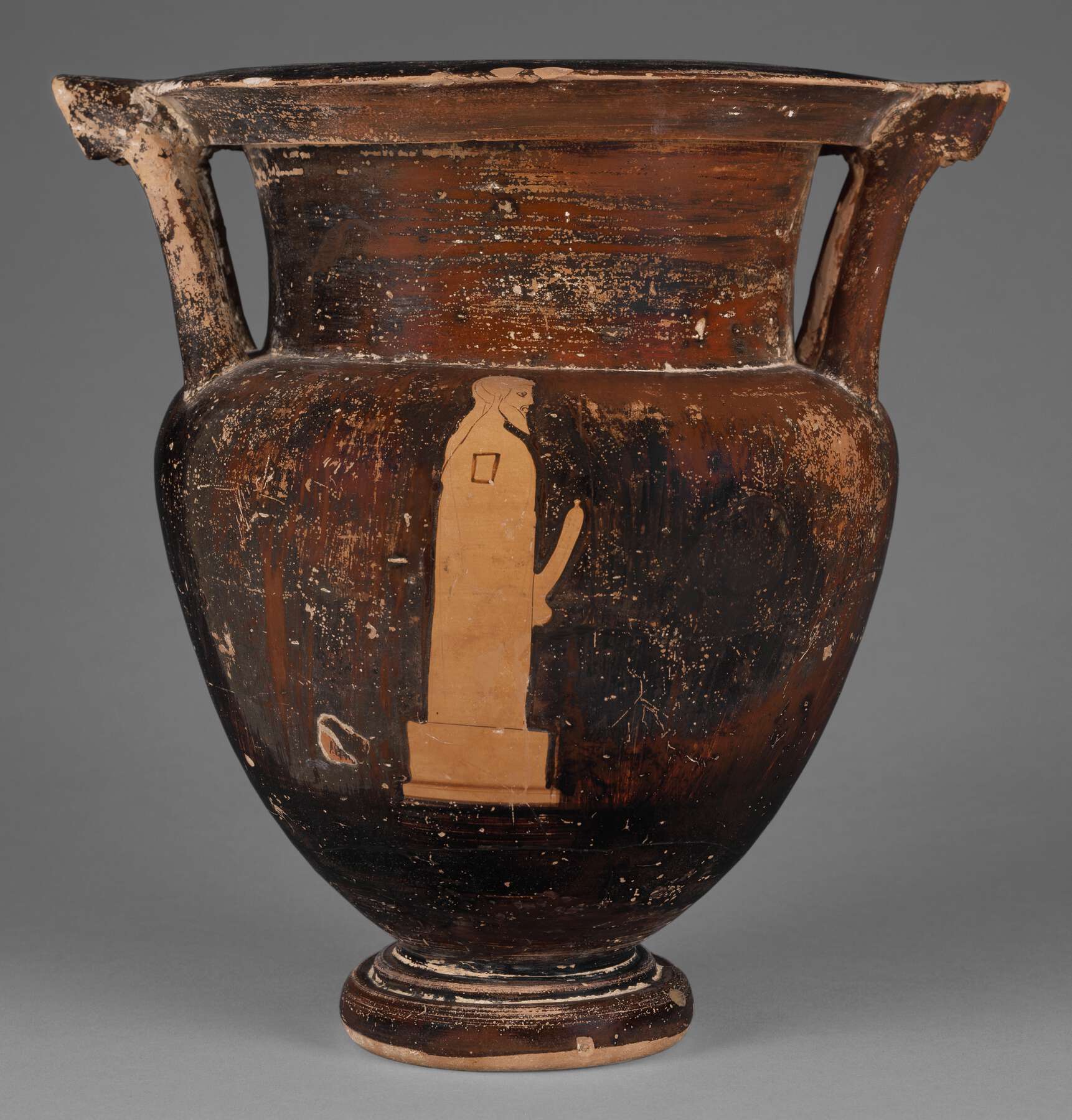 Height 31.3 cm; diam. of rim 25.2 cm (outside); diam. of rim 18.5 cm (inside); width with handles 30.1 cm; diam. of body 23.6 cm; diam. of foot 11.6 cm. Capacity to rim is 5.002 liters. Misfired in places, especially on side B. Vase intact with the black gloss surface chipped, scratched, and pitted in numerous areas, and considerably abraded. Black flaked away in small areas. Black inside. Incrustation inside.