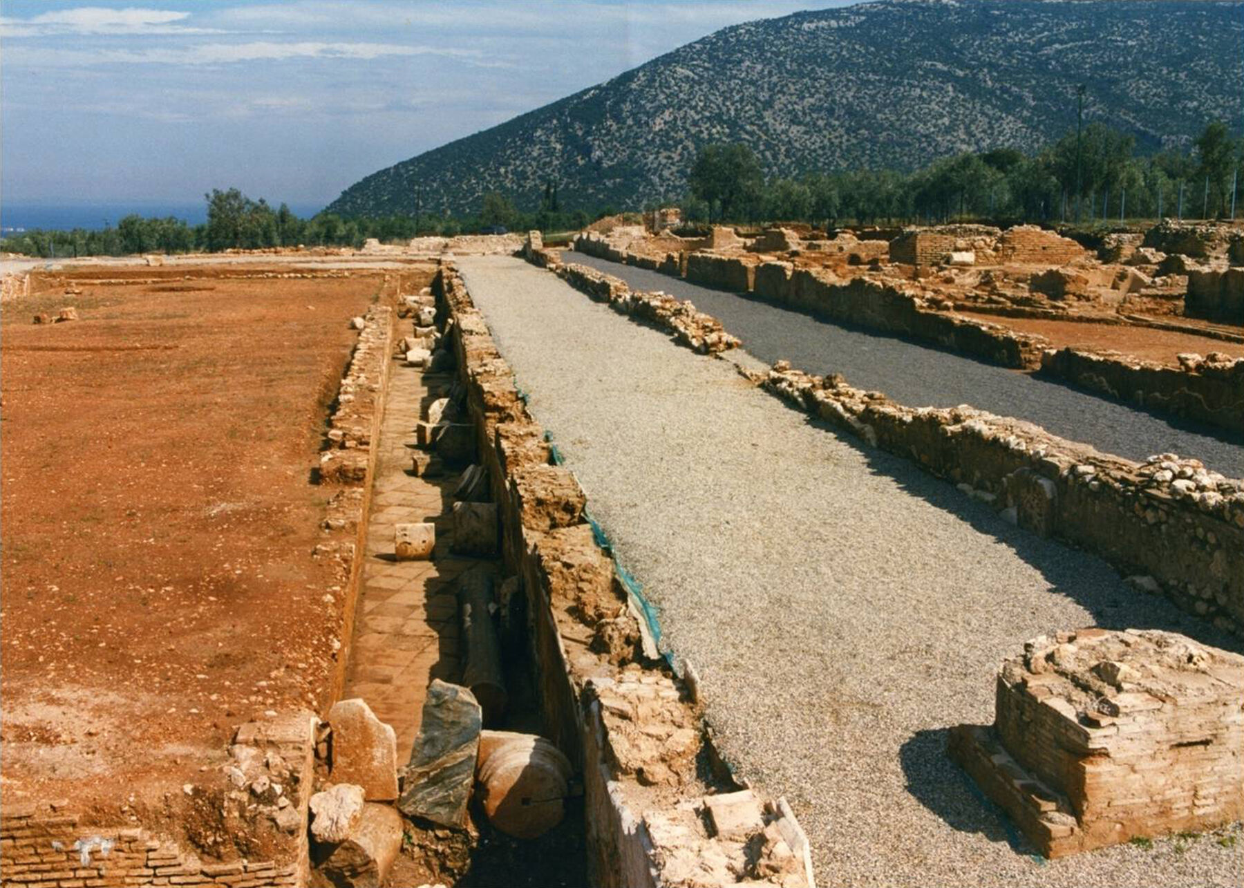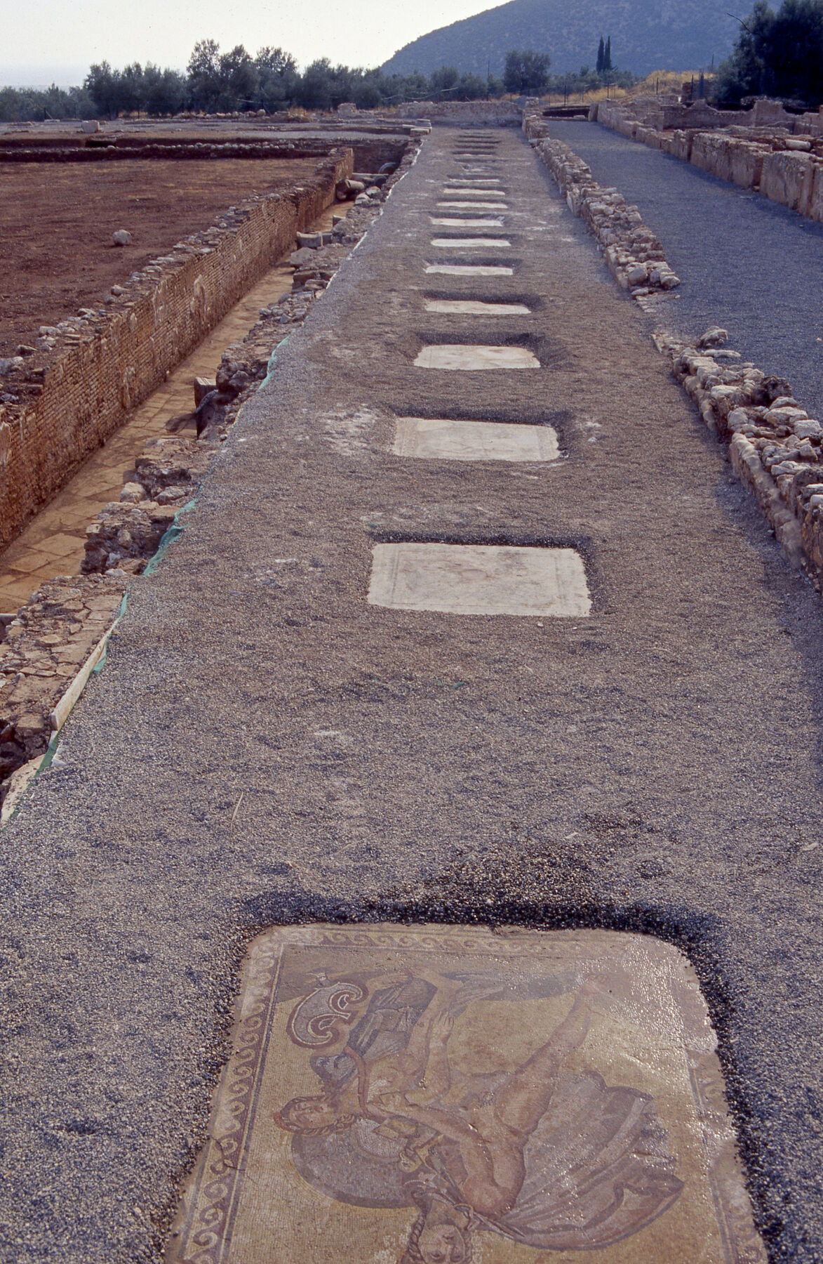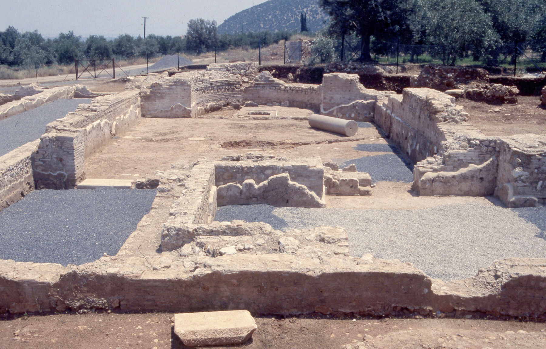 The first level was deeper than the others due to natural land formation and was adapted to accept the heavy construction of a large hypostyle hall (Great Northern Basilica), a typical hypostylos aethousa with two rows of internal colonnades supporting the roof. The walls of the hall were constructed from rectangular ashlar blocks interrupted at regular intervals by courses of strips of flat bricks. Externally these were covered by a thick layer of plaster to which marble panels were attached, some of which are still in situ. The entrance to the hall contains a large marble lintel, its sides decorated with semicolumns. Stratigraphically the various parts of the monument present a divergent picture. The thick layer of debris of the destruction level, which covers the ruins, consists of reddish soil filled with small stones, tiles, and fragments of schist and marble slabs, as well as bricks and plaster from the walls, including the mural decorations and the pavements of the villa. Inside the Great Hall this layer measures up to 3.5 meters high, a huge mass of rubble, which was kept in place thanks to the preservation of the strong walls of the building. This layer has not been removed since it fell and covered the hall, which occurred after it was found plundered and ransacked. The columns and the capitals were found at different levels of the layer of destruction, testifying to a gradual collapse of the deserted villa. Vandalism should not be excluded as the first and main destructive agent, and this might reasonably be attributed to the invasion of the Visigoths in the Peloponnese at the end of the fourth century AD.
