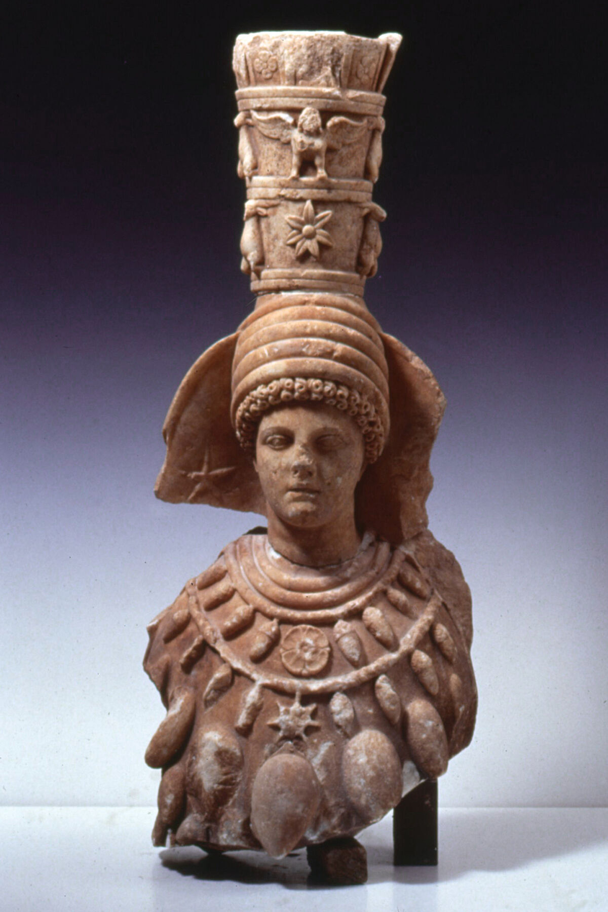 To the west, the border of the villa is designated by a large hall with an apse on the west side and five niches for statuary. This building has been identified as the Western Basilica. The two suites of rooms to the north and south of the basilica are likely sacella or lararia, since dedicatory inscriptions, as well as portraits, of a type often placed in lararia were discovered there.29 One of the side rooms of the basilica must have served as a sanctuary of Isis, judging by the discovery of the head and bust of Artemis Ephesia (fig. 6.5)30 and the portrait of a youth whose hairstyle is associated with followers of Isis.31