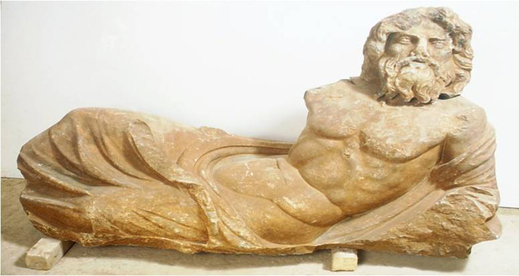 The third level of the villa contains some very interesting installations. Starting from east to west and along the main axis, one encounters the Temple-Sanctuary of Antinous-Dionysos (fig. 6.6). The initial plan had the shape of a basilica with an apse on the east side. In the middle of the apse there was an impluvium revetted with large marble plaques, fragments of which have been preserved. The floor was lavishly decorated with polychrome marbles in a technique known as opus sectile. An orthogonal pedestal was found on the northwest corner of the building. A statue of Antinous-Dionysos (fig. 6.7) originally stood on a podium in the apse of the building.32 A head of Polydeukion (a pupil of Herodes who died young) and a headless female statue, probably Herodes’s wife, Regilla, were also found in the sanctuary. Next to the Temple-Sanctuary of Antinous was an apsidal building, the Serapeion, similar to the one at Hadrian’s Villa. The identification of the building as a Serapeion has been confirmed by the discovery of both complete and fragmentary statues of river gods (figs. 6.8, 6.9), similar to those depicted on the mosaic pavements at the adjacent southern stoa. A statue of Osiris (fig. 6.10) was also found in the Serapeion, while a marble sphinx, now in the storage rooms of the National Museum in Athens, might also come from this place. Once again, the use of Dionysiac themes, operating alongside Egyptianizing motifs, serves as a stylistic embodiment of an appropriation of conquered cultures.