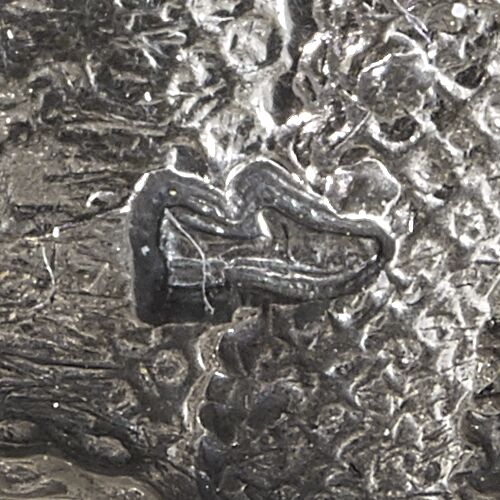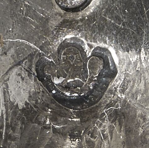 The stand consists of two parts, secured together by a threaded rod and nut: an upper part, called a “cradle” (berceau), and a lower part, the base. Each is individually marked as follows. The stand’s “cradle” (berceau) is struck, on the exterior of the rim, with the following stamps: a pointer head (the Paris discharge mark for gold and small works of silver used between October 1, 1762, and October 1, 1768, under the fermier Jean-Jacques Prévost); a hunting horn (the Paris countermark used between October 1, 1768, and November 18, 1774, under the fermier Julien Alaterre); a man’s slipper (the Paris countermark used between November 18, 1774, and July 13, 1780, under the fermier Jean-Baptiste Fouache); and a boar head (the “restricted warranty” of 800 parts per thousand, or 80 percent, minimum silver standard used in Paris exclusively from May 10, 1838). The stand’s base is struck, underneath, with the following stamps: the maker’s mark consisting of the initials “J.B.C.,” a key, and two grains below a crowned fleur-de-lys (mark 9.4); a crowned Y (the Paris warden’s mark used between July 21, 1762, and July 13, 1763); and crossed laurel branches (the Paris charge mark for small works of silver used between October 1, 1762, and October 1, 1768, under the fermier Jean-Jacques Prévost); a pointer head (the Paris discharge mark for gold and small works of silver used between October 1, 1762, and October 1, 1768, under the fermier Jean-Jacques Prévost). The stand’s base is struck, on the surface, with the following stamps: a hunting horn (the Paris countermark used between October 1, 1768, and November 18, 1774, under the fermier Julien Alaterre) (mark 9.5); a man’s slipper (the Paris countermark used between November 18, 1774, and July 13, 1780, under the fermier Jean-Baptiste Fouache) (mark 9.6); a boar head (the “restricted warranty” of 800 parts per thousand, or 80 percent, minimum silver standard used in Paris exclusively from May 10, 1838) (mark 9.7); and a swan in an oval (the standard mark for silver of unknown origin that is sold at auction as used by contracting countries between July 1, 1893, and 1970) (mark 9.8).