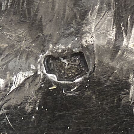 The base appears to have been raised from sheet. Its undulating perimeter may have been made separately and soldered in place. A silver threaded rod, soldered to the underside to the earthen floor of the support, anchors to the base and is secured with a silver nut underneath. Two additional pins from the earthy floor fit into the base to keep it from twisting out of alignment. Technical Report, December 9, 2021, by Julie Wolfe, Decorative Arts and Sculpture Conservation, J. Paul Getty Museum. ↩︎