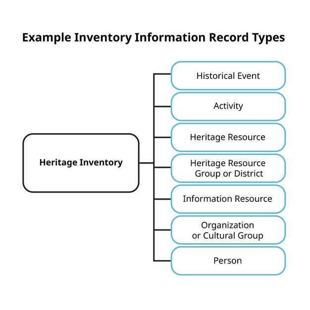 Record types. As shown in figure 2.2a, a single inventory typically contains many types of information records, for example, immovable heritage resources (e.g., buildings, landscapes, archaeological sites, underwater heritage), intangible heritage (e.g., spiritual practices, oral traditions), collections of movable cultural materials associated with places, activities (e.g., surveys, conservation interventions), persons (e.g., architects, historical figures), organizations, or information resources (e.g., images, reports).