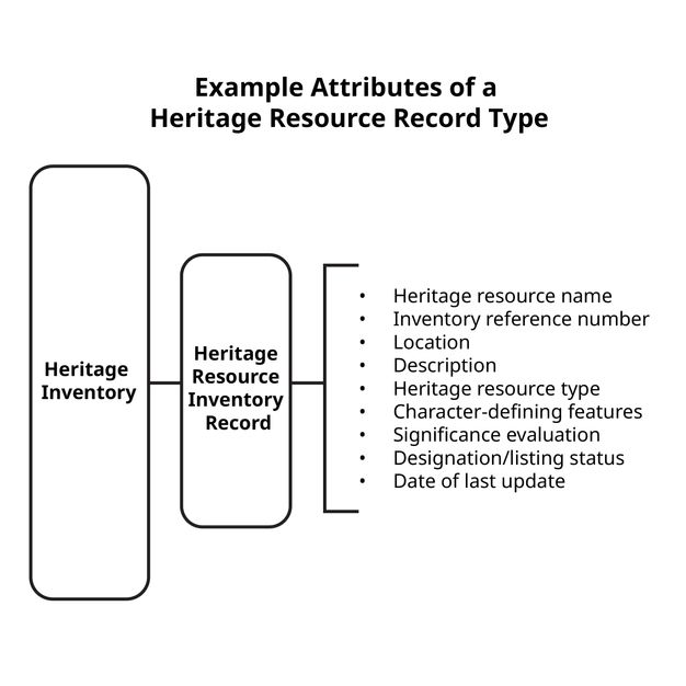 Attributes for each information record type. As shown in figure 2.2b, a heritage resource record type might include the following attributes: heritage resource name, inventory reference number, location (expressed through geographic coordinates, address, etc.), description, heritage resource type, character-defining features, significance evaluation, designation or listing status, and date of last record update.