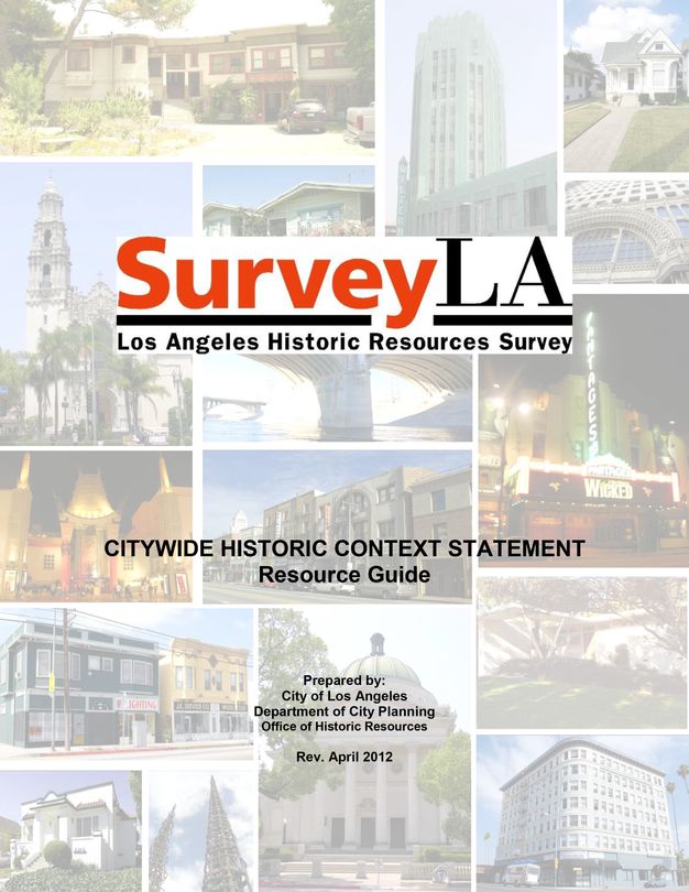 A range of heritage organizations and agencies have published historic context statements and related theme studies that may provide useful information and can be studied as prototypes (see National Park Service. 2021. “Full List of Theme Studies.” National Historic Landmarks. https://www.nps.gov/subjects/nationalhistoriclandmarks/full-list-of-theme-studies.htm). SurveyLA’s citywide historic context statement, for example, has relevancy for other Southern California communities that share similar development patterns and related historical themes and associated resource types (see Los Angeles City Planning Department. n.d.c. “Historic Themes.” Accessed February 11, 2022. https://planning.lacity.gov/preservation-design/historic-resources/historic-themes).