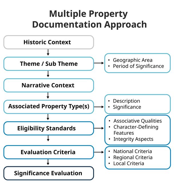 This section provides recommendations and considerations for developing historic context– and theme-based heritage surveys (see the sidebar on this topic in chapter 2). It draws on the experience of SurveyLA and, in particular, the adaptation of the multiple property documentation (MPD) approach (National Park Service. 1999. How to Complete the National Register Multiple Property Documentation Form. Washington, DC: U.S. Department of the Interior. https://www.nps.gov/subjects/nationalregister/upload/NRB16B-Complete.pdf) to guide development of a context-based methodology. As described in chapter 7, in the Historic Preservation Practice in the United States sidebar, the National Park Service developed the MPD approach to streamline the nomination of thematically related properties to the National Register of Historic Places. But this format is also highly adaptable for surveys of all types, scales, and complexities at the national, regional, or local level. It is particularly relevant to those carrying out surveys in the United States but may also be of interest to others.