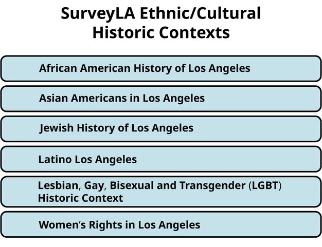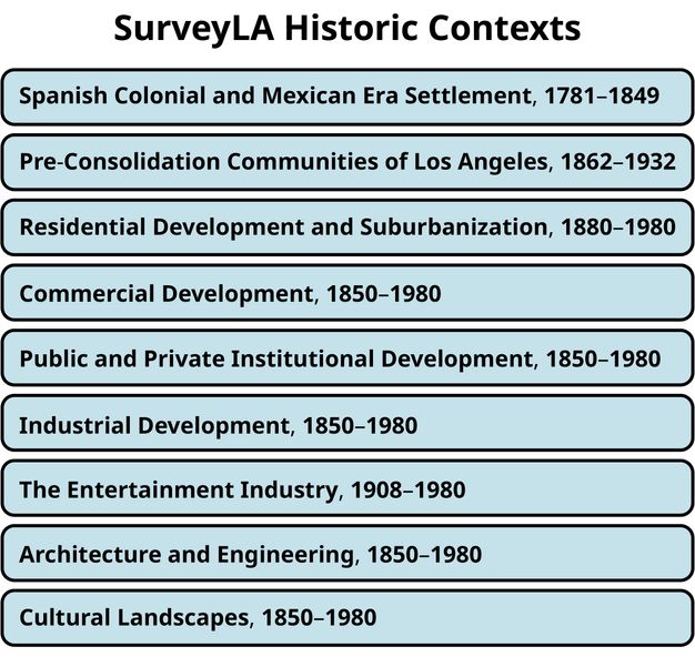 For the SurveyLA citywide historic context outline and published narrative contexts/themes, see https://planning.lacity.gov/preservation-design/historic-resources/historic-themes. ↩︎
