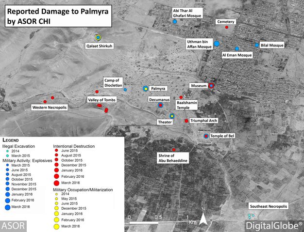 Inventories and related condition surveys are also key tools for systematically determining intervention priorities to rehabilitate heritage places damaged during armed conflicts. Using remote sensing technologies, such as satellite imagery, in conjunction with inventories, it is possible to carry out ongoing damage assessments during conflicts to help prepare postconflict intervention priorities and plans (fig. 12.6) (Fiol, Manuel, and Youmna Tabet, eds. 2018. Five Years of Conflict: The State of Cultural Heritage in the Ancient City of Aleppo. A Comprehensive Multi-temporal Satellite Imagery-Based Damage Analysis for the Ancient City of Aleppo. Paris: UNESCO and UNITAR. https://unesdoc.unesco.org/ark:/48223/pf0000265826/PDF/265826eng.pdf.multi; Danti, Michael, Scott Branting, and Susan Penacho. 2017. “The American Schools of Oriental Research Cultural Heritage Initiatives: Monitoring Cultural Heritage in Syria and Northern Iraq by Geospatial Imagery.” Geosciences 7, no. 4: 95. https://doi.org/10.3390/geosciences7040095). These remote activities can be supplemented by on-the-ground surveys when feasible.