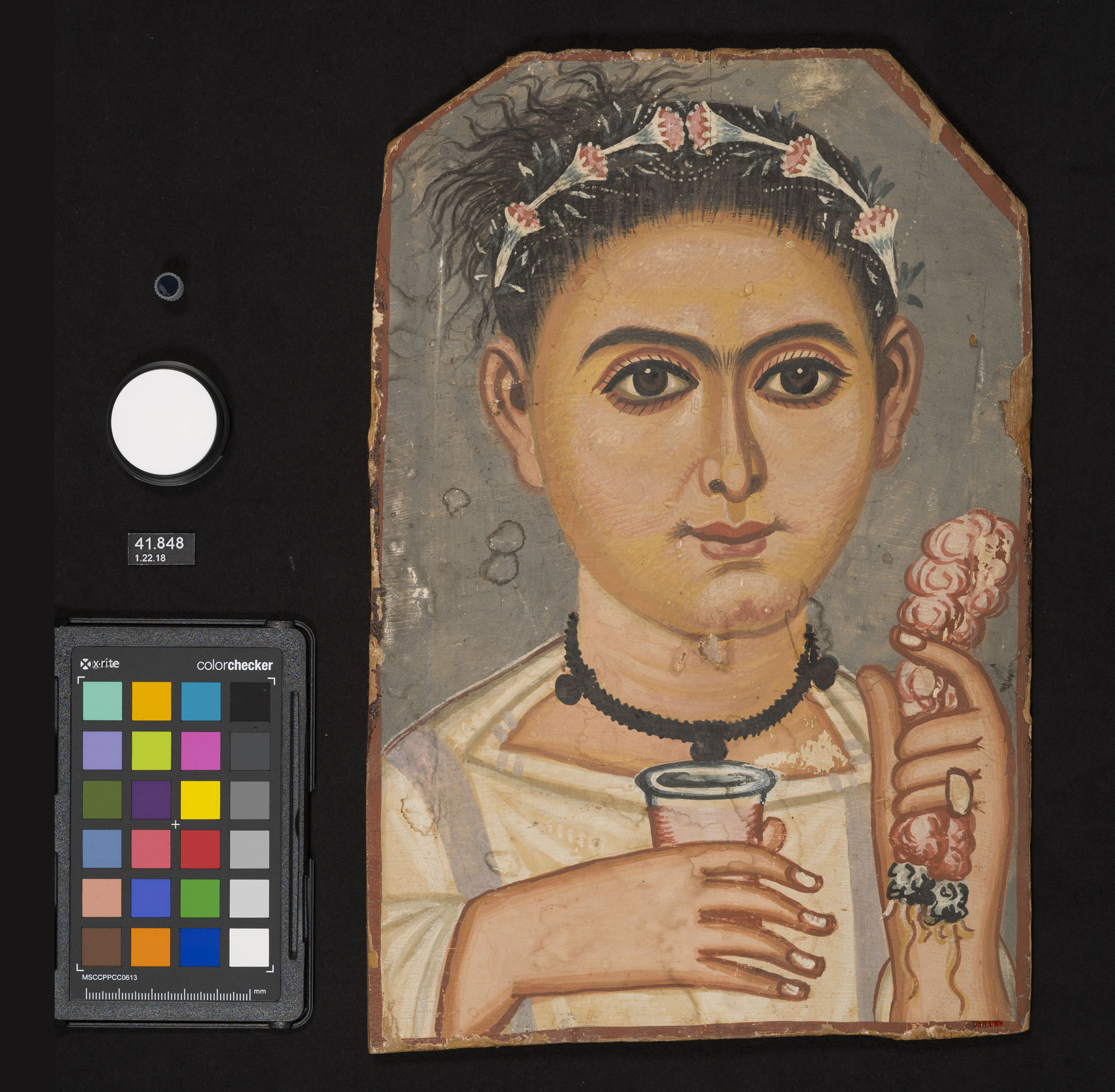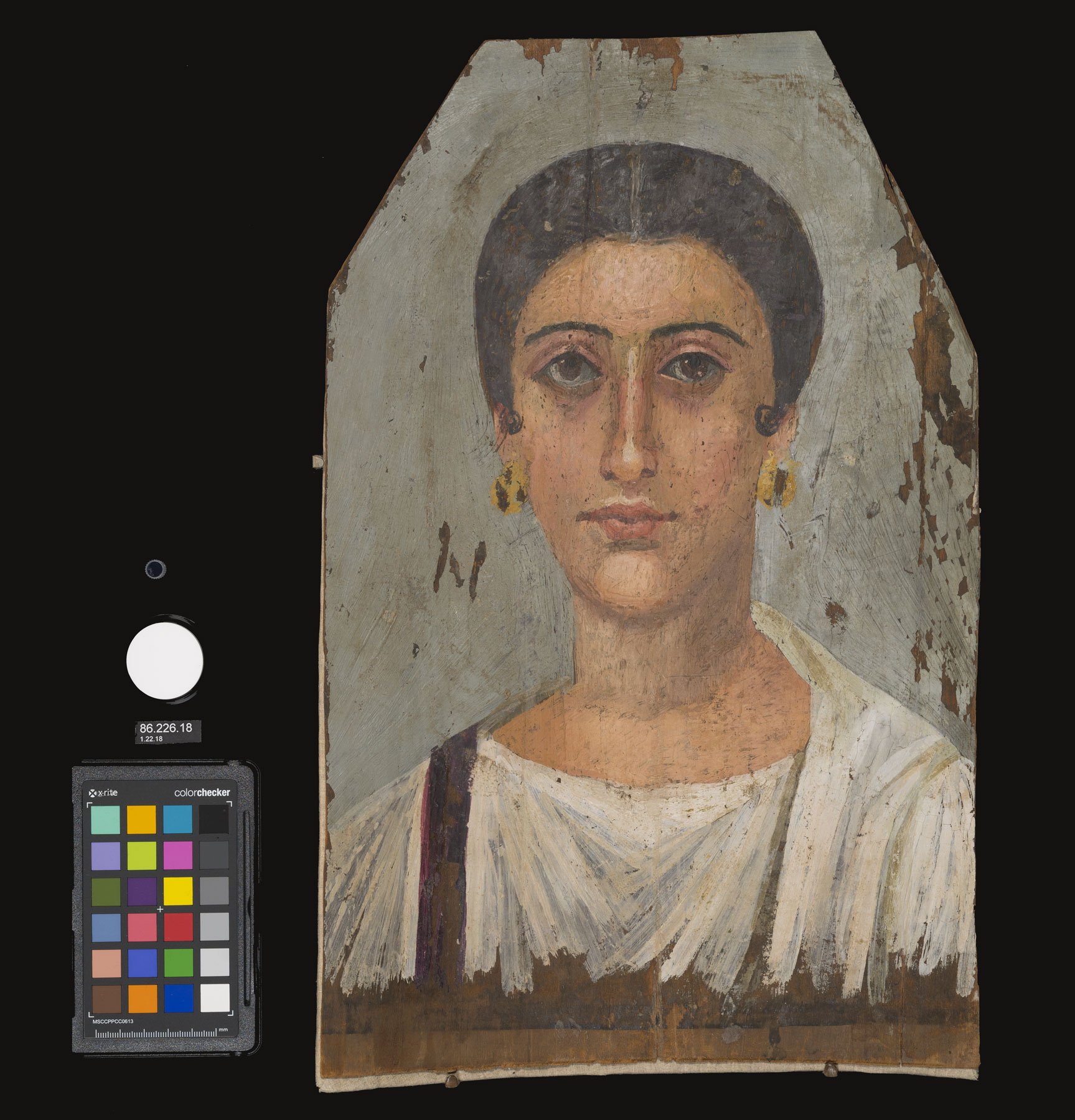 The Brooklyn Museum (BKM) began acquiring Egyptian antiquities in 1902 and now boasts one of the largest holdings of Egyptian materials in the United States. This renowned collection contains six Romano-Egyptian funerary portraits on : Portrait of Demetrios (11.600, AD 95–100), Woman with Earrings (1996.146.9, AD 100–105), Mummy Portrait of a Man (ca. AD 120–130), Noblewoman (ca. AD 150), Boy with a Floral Garland in His Hair (ca. AD 200–230), and Portrait of a Young Person (ca. AD 200–230). Two of these portraits are characterized as paintings with aqueous and four as paintings with wax binding media. Aside from the Noblewoman portrait (fig. 7.1), which has been extensively restored, the portraits survive in remarkably good condition. All six portraits were documented and analyzed through visual examination, , , , , , , and .