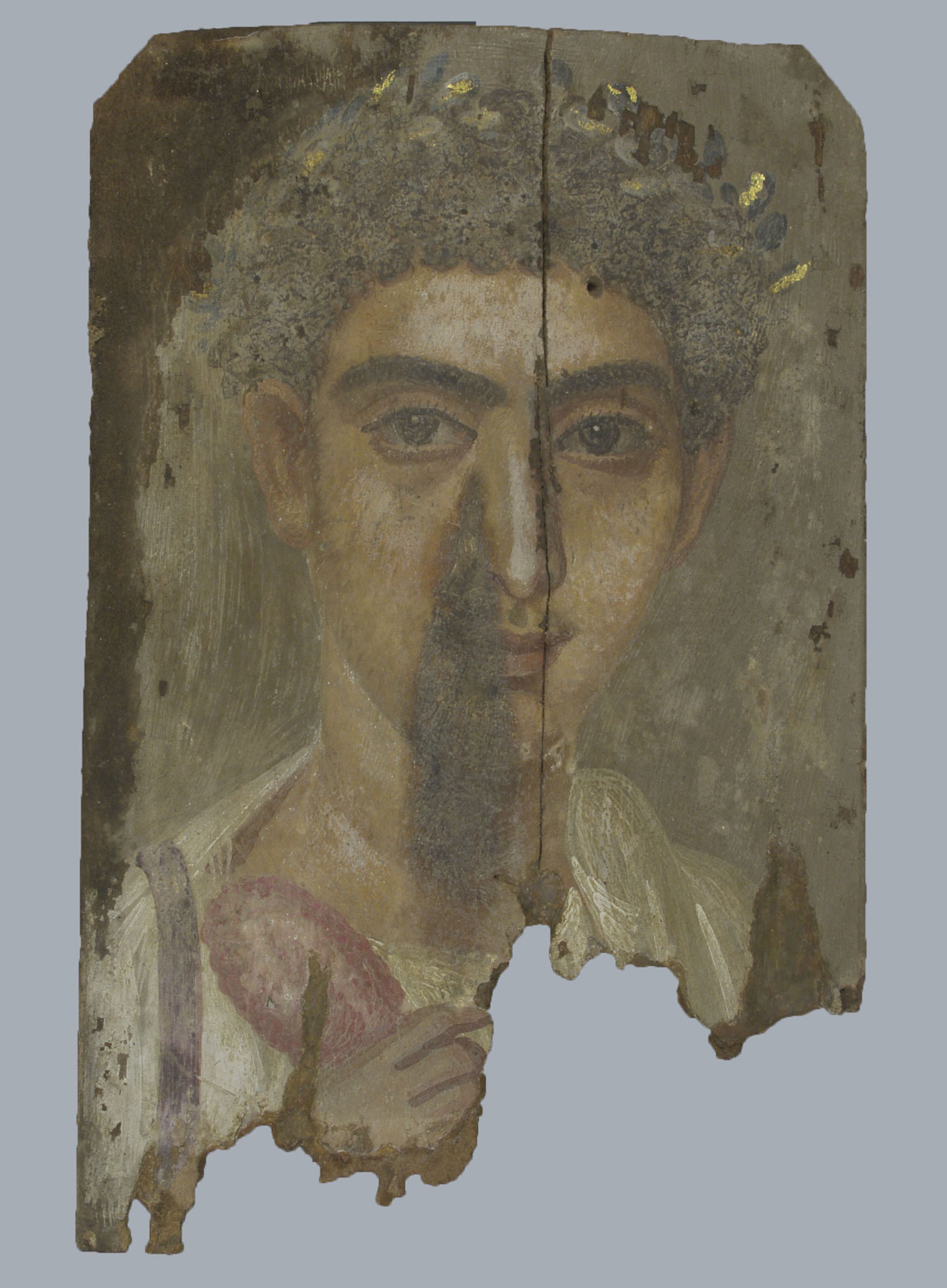 Mummy Portrait, Romano-Egyptian, second century AD. Tebtunis, Egypt. Encaustic paint on sycomore fig panel, 34.8 x 22.5 cm (13 11/16 x 8 7/8 in.). Berkeley, University of California, Phoebe A. Hearst Museum of Anthropology, 6-21378b.fullscreenFigure 14.3Mummy Portrait, Romano-Egyptian, second century AD. Tebtunis, Egypt. Encaustic paint on sycomore fig panel, 34.8 x 22.5 cm (13 11/16 x 8 7/8 in.). Berkeley, University of California, Phoebe A. Hearst Museum of Anthropology, 6-21378b.
