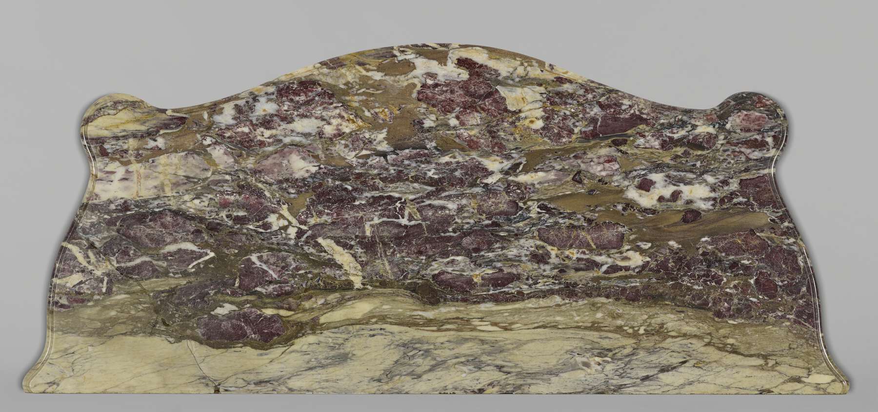 The origin of the “flowers” in this marble is described by Dubarry de Lassale as possibly derived from stromatolites (structures created by algae in certain shallow warm-water marine environments).32 In the trade, fleur de pêcher, or fior di pesco, is often referred to as marmor calcidicum. Lazzarini and Borghini describe the source as Eretria, Calcide, Greece.33 However, Dubarry de Lassale (and modern manufacturers) state the source of fior di pesco is Serravezza, Carrara Basin, Italy, from a quarry opened in the seventeenth century. The tabletop is 3 cm thick. There is an old, repaired fracture in the right rear quadrant.