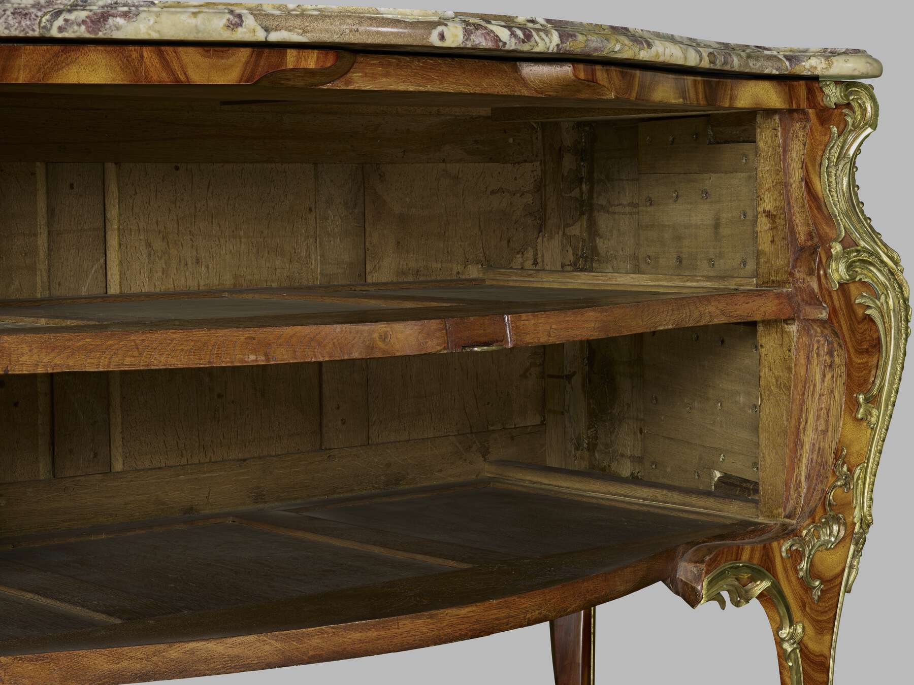 Another unusual aspect of wood selection in the commode is the use of poplar for the panels of the dustboard. The use of poplar is extremely rare in Parisian ébénisterie. The only other confirmed examples in the Museum’s collections are in the serre-papiers by Bernard II van Risenburgh (cat. no. 3), where it was selected as a ground for the black European lacquer and for a small secret compartment panel in a cabinet by Benneman that dates to the 1780s (78.DA.361). Even in menuiserie, poplar is an unusual choice. In the Museum’s collection it has only been documented in a pair of globes, also decorated in European lacquer (86.DH.705). The fact that the most recent major restoration of the commode (presumably by P. Spohn; see below) utilized panels of poplar to reinforce the case sides suggests the possibility that the dustboard panels were replaced at this time, although conjuring a motive for replacing well-protected, interior panels such as these is rather difficult. In addition, careful examination reveals no evidence that the case of the commode has been dismantled to the extent necessary for the panels to have been replaced. It would appear that the originality of the poplar panels must remain unresolved for the moment.