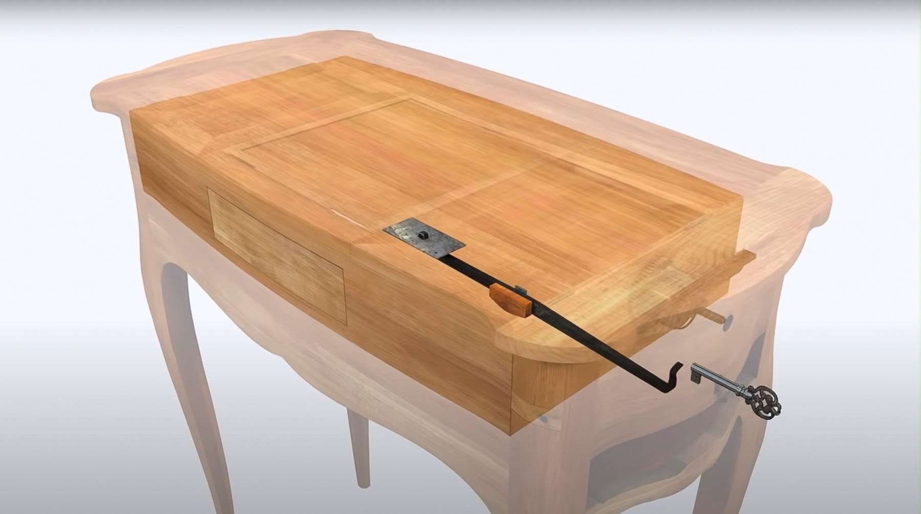 Figure 18-12The sliding mechanism for the top and case is activated with a second, smaller key that is inserted into an additional keyhole on the right side, beneath the one used to wind the mechanism (fig. 18-13fig. 18-13fig. 18-13). Turning the key moves a lever that is mounted on a long iron plate, housed in the upper case bottom (fig. 18-14fig. 18-14fig. 18-14). Moving the lever releases a catch at the center of the bottom of the sliding drawer case, allowing the case to slide forward, propelled by the springs.