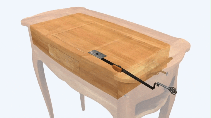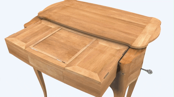 The table, unlike most of the mechanical pieces by Oeben, is devoid of any strip mounts following the lower profiles of the piece and outlining the legs. It is probable that the carrying handles are a later addition, for the model does not appear elsewhere on his work and they are also somewhat incongruous on such a small and relatively light piece of furniture.