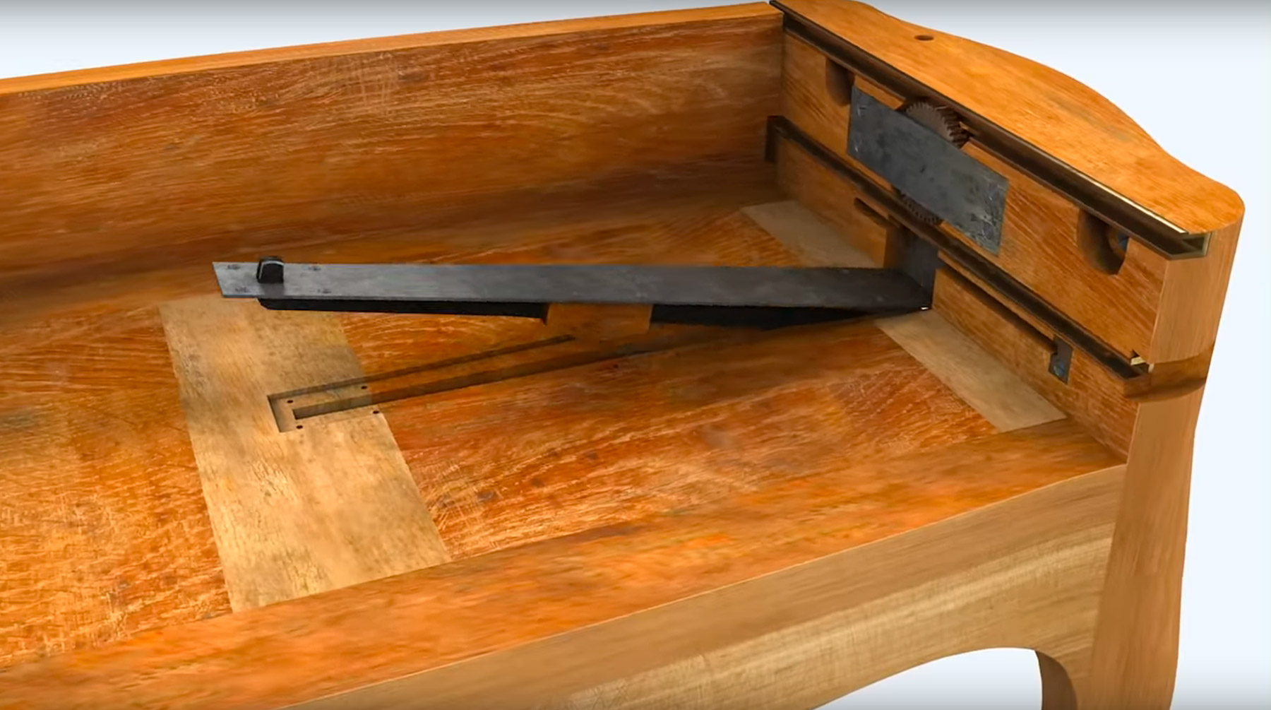 Figure 18-8The table’s sliding drawer case spring mechanism is powered by a pair of matching main springs housed in barrels on either end of the table. Some other early examples of this form by Oeben employ an alternate spring release mechanism based on flat springs and crossed push rods (fig. 18-9). There is no evidence that the Museum’s table ever had a flat spring-type mechanism; however, during examination, the existing spring mechanisms were removed, and it became clear that there has been some modification to the mechanical system in the past. There are four, more closely spaced, old screw holes beneath the current iron mounting plates that appear to be associated with earlier, smaller, spring mechanisms (fig. 18-10) or perhaps even a gear wheel without a spring mechanism. One of the iron plates to which the current barrels are fixed bears an as yet unidentified stamp with the initials “MB” on it. The springs can be wound by a key on either side of the table. Two toothed rails, attached at either end of the underside of the table’s top, engage the teeth at the top of the barrel, while two other toothed rails, attached to either side of the sliding drawer case, engage with the teeth at the bottoms of the barrels (fig. 18-11). The drawer case’s rails have extraneous holes and wooden patches adjacent to them, suggesting that they have been repositioned, possibly at the same time as the springs were modified. Both on the top and on the sliding case, the toothed rails slide into U-shaped brass guide rails set into the case sides above and below the toothed wheel. The lower brass guides do not extend to the fronts of the legs. Small sliding blocks cover the front access to the brass guides. These can be removed to allow the toothed rails on the sides of the sliding case to be inserted or removed from the guides (fig. 18-12).