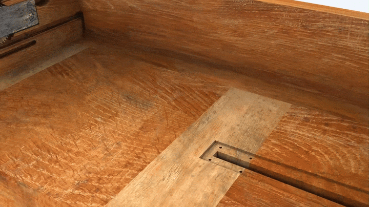 The long side drawer is located between the upper and lower case bottoms. The four drawer sides are connected to one another with three small dovetails at each corner, through-dovetails at the rear and half-blind at the front; at the front, the sides of the dovetails are covered by veneer. The drawer bottom is made of two oak boards of equal width, butt joined and with the grain parallel to the long sides. The bottom panel is rabbeted along the lower edges and held in grooves in the drawer front, sides, and back. The back side of the drawer is notched at the top to accommodate the mechanism that releases the central sliding drawer case.