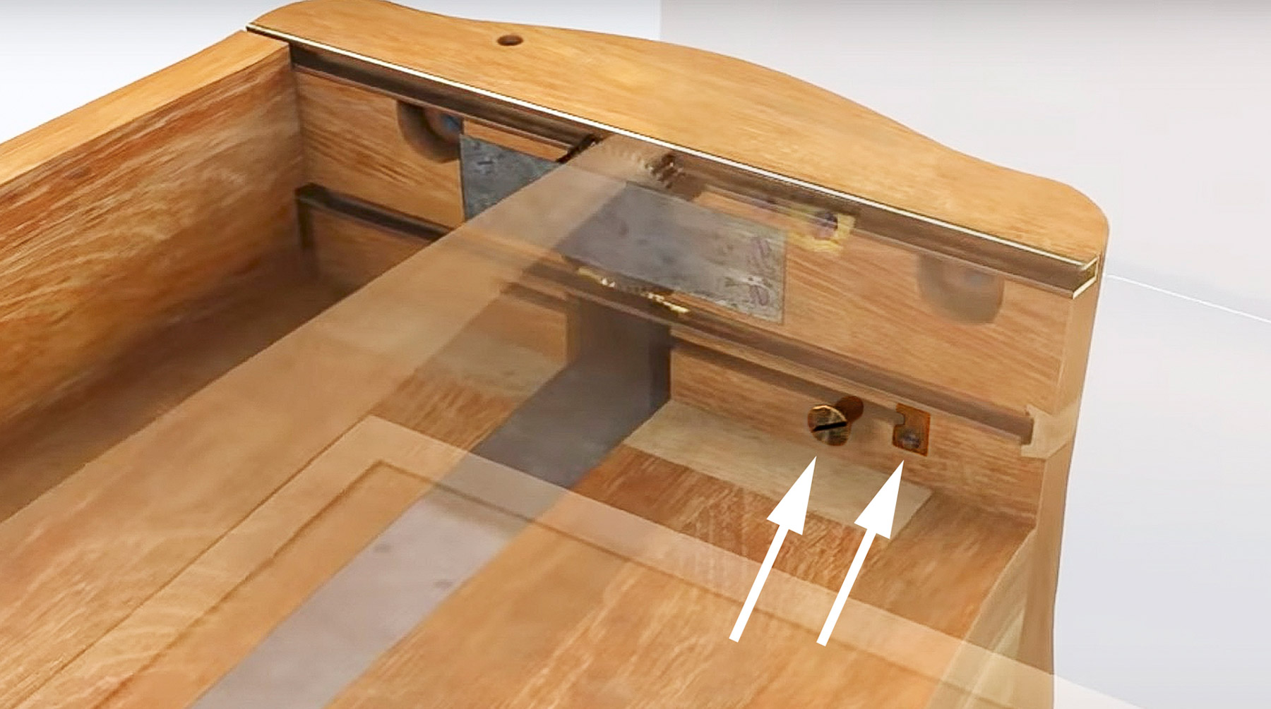 Mechanical stops prevent the top and case from sliding too far forward or back. The top is constrained by iron rods that run vertically up through holes in the case sides. These project above the top surface of the case sides and into grooves cut into the underside of the top. At either end of the grooves, brass plates that limit the travel of the top are screwed in place. The vertical iron stop rods are of different length on either end of the table because of the presence of the side drawer front on the right side. On the left side of the table, the rod runs through the entire height of the case side and is held in place by a small brass plate, screwed into the bottom of the case side, that covers the end of the hole in which the rod is held. This allows the iron rod to be easily removed from below so that the table can be disassembled. On the right side, the rod descends only to the level of the top of the side drawer, and the corresponding brass cover plate is located inside the drawer compartment. The cross rail that runs below the drawer front is also drilled with a hole to allow the rod to be inserted and removed from below, though there is no brass cover plate for this hole.