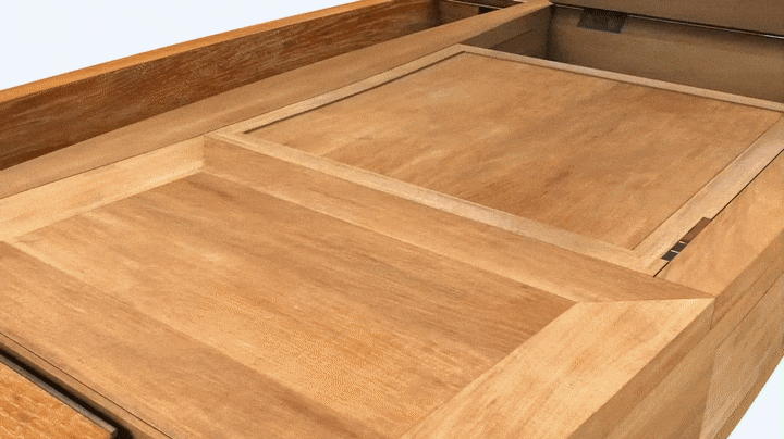 The center compartment of the sliding drawer case is divided into an upper and lower section by a horizontal oak panel with side-to-side grain orientation, rabbeted along its lower edges and held in grooves in the case front, back, and dividers. Below this medial panel, the central compartment is fitted with a spring-loaded concealed drawer whose veneered front blends seamlessly with the geometric pattern of parquetry surrounding it. The drawer is constructed primarily from juniper; the exception is the front board, which is made from oak, veneered on the edges and the inside with juniper. The drawer bottom is made of three small quarter-sawn boards, with matching grain, arranged with the grain running from side to side. There is no handle on the front of the drawer. The drawer is opened by depressing a brass lever on the underside of the front edge of the sliding drawer compartment, below the drawer front. This lever releases a catch on the bottom edge of the drawer front, and the drawer springs forward, propelled by a thin, crescent-shaped iron spring, approximately 3 cm high and 20 cm wide. The spring is attached with two screws, at its midpoint, to the back wall of the drawer compartment behind the drawer.