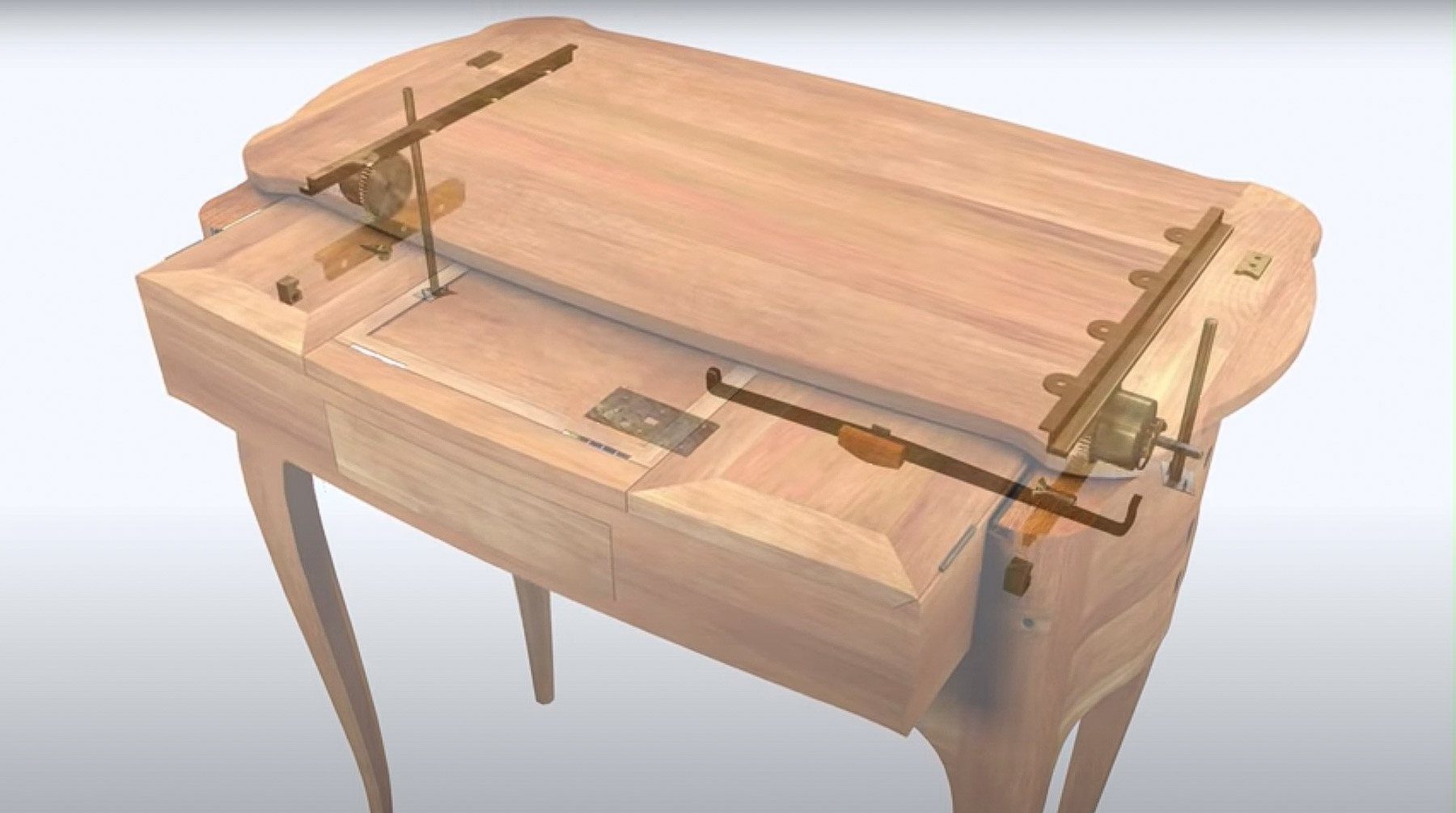 The body of the table is occupied at the lower level by a shallow lockable drawer that extends from the right (fig. 18-2). Above is a deeper drawer that springs open by mechanical means from the front of the table. It contains lidded compartments to either side of a lifting panel. The lids are veneered with panels of chevron parquetry and on their undersides with quarter-cut panels of tulipwood, all outlined with double stringing. The central panel is hinged, and when raised it can be supported by a manually activated lifting metal tab that fits into any one of a series of notches cut into the back. The face of the panel is lined with a bluish-green silk, surrounded by stringing. The lower part is hinged and forms a book or paper support. It is veneered with a narrow panel of tulipwood and is similarly outlined. Below the shallow, lidded compartment is a small drawer that may be mechanically released and is pushed forward with a spring. The remaining areas of the lidded drawer, its sides and interior, are veneered with amaranth.